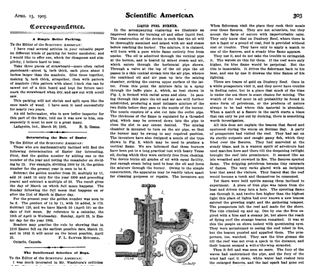- Scientific American issue Vol 92 No 15, April 15, 1905: Liquid Fuel Burner