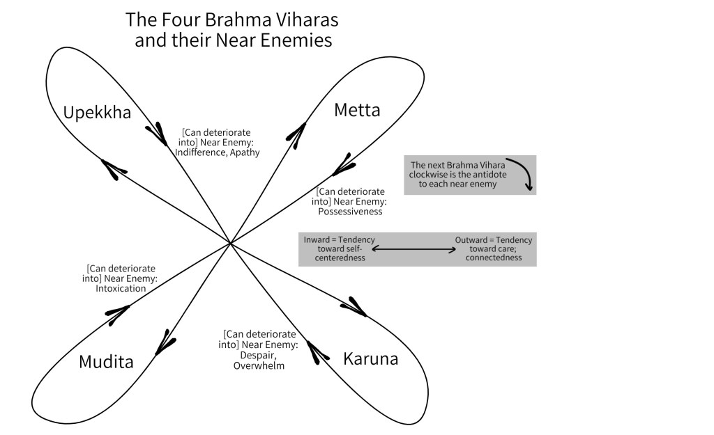 And here’s diagram I created to show the same thing, highlighting in a more visual fashion the interplay between each of the Brahma Viharas… noting also the dynamic between interdependence / care / connectedness (toward the outside edge of the diagram) and self-centeredness / ego-clinging (toward the inside of the diagram):